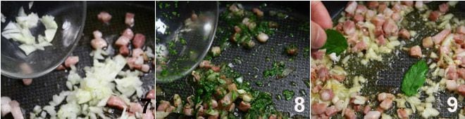 la cebolla 7, el perejil 8 y las hojas de menta 9. Sofría todo durante unos minutos hasta que la cebolla esté pochada.