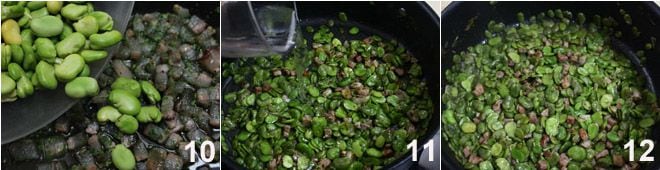 Luego agregue las habas 10, desglase con el vino blanco, agregue la sal, la pimienta y cocine durante unos veinte minutos añadiendo de vez en cuando el caldo de verduras 11. El tiempo de cocción puede variar según el tamaño y la ternura de las habas. Una vez cocido 12, sirva las habas calientes, adornadas con algunas hojas de menta fresca.