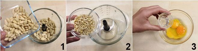 Para preparar las habas de los muertos, comienza por triturar en un procesador primero las almendras muy finamente 1 (ten cuidado de no calentarlas demasiado, de lo contrario soltarán aceite) y luego los piñones 2. En un bol bate el huevo y las yemas con la grappa 3.