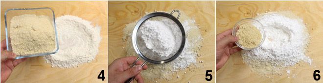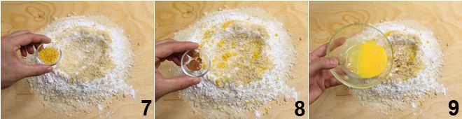En una superficie enharinada coloca la harina 4, las almendras trituradas 4 y tamiza el azúcar glas 5. Añade también los piñones reducidos a harina 6 y mezcla los polvos con las manos, formando en el centro un volcán.