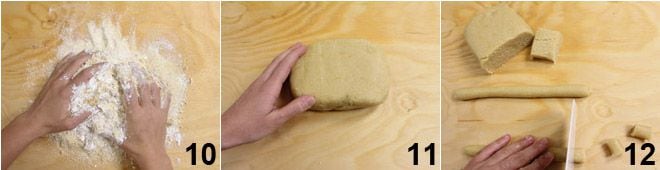 comienza a amasar con las manos 10 hasta obtener una masa compacta y moldeable 11. Corta un trozo de masa a la vez y forma un cilindro del diámetro de 1 cm, luego divídelo en trocitos también de 1 cm de ancho 12.