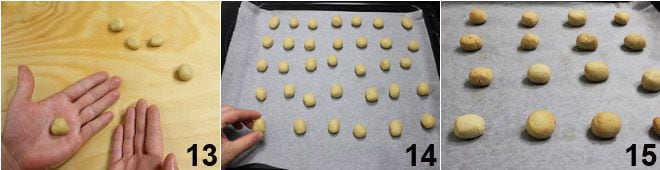 Modela los trocitos con las manos dándoles una forma redonda 13 y procede así hasta agotar la masa. Coloca las bolitas obtenidas en una bandeja de horno forrada con papel para hornear 14 y hornéalas a 180° por 15 minutos: deberán estar apenas doradas en la superficie pero no demasiado coloreadas 15. Saca los pastelitos del horno y déjalos enfriar: ¡no te queda más que servir tus habas de los muertos a tus invitados, incluso a los que no ves!