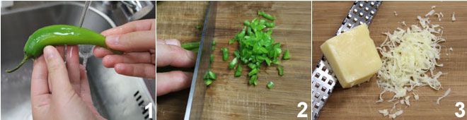 Para preparar el hojaldre tex-mex: lavad bien el chile 1, cortadlo en trozos pequeños 2 y rallad el queso gruyer 3.