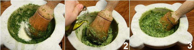 Para preparar los hojaldres con aceitunas, pesto y ricotta, empieza con la preparación de un buen pesto casero: coloca en un mortero (o en la batidora) la albahaca lavada y bien seca, los quesos rallados 1, los piñones, una pizca de sal y el aceite de oliva virgen extra 2, luego machaca con el mortero (o tritura en la batidora) hasta obtener una salsa cremosa 3.