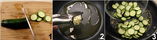 Para preparar los hojaldres con aceitunas y calabacines salteados, empieza preparando los calabacines: lávalos, elimina los extremos y córtalos en rodajas de aproximadamente 2 mm 1. En una sartén antiadherente, calienta el aceite de oliva virgen extra, añade el ajo machacado 2 y dóralo, luego añade los calabacines 3 y deja que se impregnen del sabor.