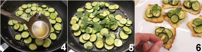 Si fuera necesario, añade un par de cucharadas de caldo de verduras 4. Cuando los calabacines estén cocidos pero aún crujientes, apaga el fuego, sala y pimienta al gusto y añade la albahaca troceada 5. ¡Cubre cada hojaldre con algunos calabacines salteados, un par de piñones 6 y una hojita de albahaca!