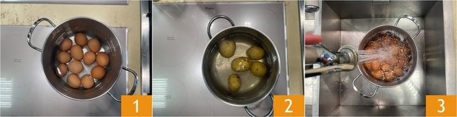 Para preparar los huevos rellenos de Pascua, lo primero es hervir los huevos. Colócalos en una olla con agua fría. Cocina a fuego medio contando 7-8 minutos desde que hierve 1. Cocina también las patatas, empezando con agua fría, durante unos 30 minutos desde que hierve 2. Cuando los huevos estén cocidos, escúrrelos y enfríalos bajo agua fría corriente 3.