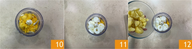 Recoge las yemas dentro de un procesador de alimentos 10; añade también los restos de las claras 11 y las patatas peladas en cubos 12.
