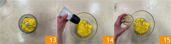 Tritura la mezcla hasta obtener una crema 13. Transfiérela a un bol, sala 14 y añade pimienta al gusto; añade también la mostaza 15.