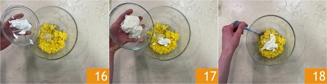 Añade el queso para untar 16, la mayonesa 17 y mezcla bien 18.