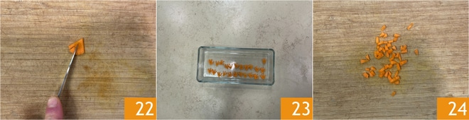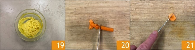 Cuando obtengas una mezcla homogénea 19, transfórmala a una manga pastelera con boquilla lisa de 12 mm. Pela la zanahoria y córtala en rodajas finas 20. Corta los dos lados de la rodaja, para obtener un triángulo con un lado curvo 21.