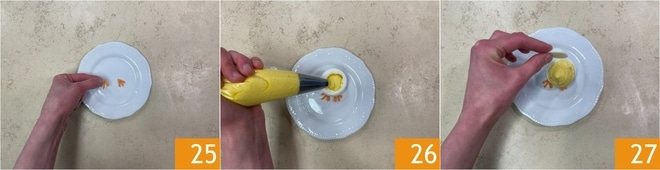 Ahora monta los huevos rellenos de Pascua. Coloca las patas en un plato 25, coloca encima la clara destinada a ser el recipiente y rellénala con la crema de huevos y patatas 26. Pon la tapa de clara 27.