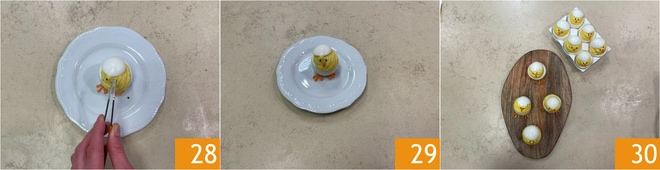 Realiza los ojos con semillas de sésamo negro 28 y añade el pico 29. Tus huevos rellenos de Pascua están listos 30, consérvalos en el frigorífico hasta el momento de servirlos.