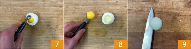 Quita la yema cocida usando un sacabolas o una cucharita 7 8. Recorta la parte superior de la clara que habías reservado 9, de modo que la reduzcas ligeramente.