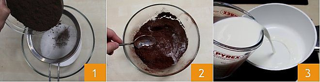 Para preparar el iced mocha, comenzad por el chocolate: en un bol poned el azúcar, añadid el cacao amargo tamizado 1 y mezclad con una cucharilla 2, luego en un cazo verted la leche fría 3.