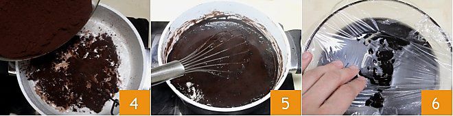 A continuación, unid el cacao mezclado con el azúcar a la leche 4 y haced que se disuelva mezclando con una varilla para eliminar los grumos 5. Luego encended el fuego. Cuando empiece a hervir, bajad al mínimo y dejad cocer a fuego lento durante 10 minutos. Una vez listo, verted el chocolate en un bol y cubridlo con film a contacto 6, dejad que se enfríe a temperatura ambiente y luego ponedlo en la nevera 2 horas para que espese.