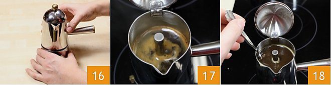 No presionéis con la cucharilla, ni hagáis agujeros y enroscáis bien la cafetera 16 (para evitar que el café se salga por los lados mientras sube), luego ponedla sobre una llama baja y constante, para obtener un café consistente. A medida que el café suba, se formará una espumita densa 17; aconsejamos no dejar hervir demasiado el café, para mantener intactos su aroma y dulzura. Luego apagad el fuego, mezclad el café directamente en la moka con una cucharilla, para hacerlo más homogéneo 18 y vuestro café para usar en la preparación está listo.