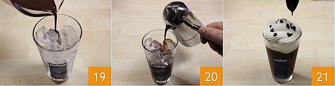 Pasad entonces a componer vuestro iced mocha. Para cada vaso alto poned 6-7 cubitos de hielo, luego verted en orden primero 50 ml de chocolate frío 19, luego 50 ml de café 20 dejando 3-4 cm desde el borde. Mezclad y terminad la preparación del iced mocha con la decoración de nata montada, ayudándoos con una manga pastelera con boquilla de estrella. Proceded de la misma manera también para los otros vasos. Podéis añadir a gusto sobre la nata más chocolate fundido para un iced mocha aún más sabroso 21!