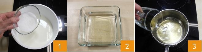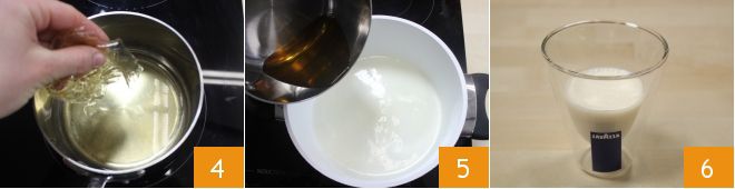 Para preparar el Irish coffee semilíquido, calienta en un cazo la nata con la leche y el azúcar 1, cocinando todo a fuego bajo y removiendo con frecuencia, hasta que hierva. Apaga el fuego y mientras tanto pon a remojo la gelatina en abundante agua fría durante 5 minutos 2. Calienta el whisky en un cazo, a fuego bajo durante 5 minutos 3,