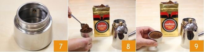 Mientras tanto prepara el café con la cafetera: para obtener un excelente café, llena la caldera de tu cafetera con agua fría y preferiblemente con bajo contenido de cal, asegurándote de no superar la válvula de seguridad 7 (de lo contrario obtendrás un café más largo). Llena el filtro con el café molido, formando un pequeño montículo que nivelarás golpeando el filtro sobre la mesa con movimientos firmes (8-9). No presiones con la cucharilla, ni hagas agujeros en la superficie.