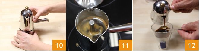 Cierra la cafetera muy apretada 10, de modo que el café no salga por los lados mientras sube, y colócala sobre una llama baja y constante para obtener un café con cuerpo. A medida que el café sube, se formará una espumita densa 11: te aconsejamos no dejar que el café burbujee demasiado tiempo para mantener intacta su dulzura y aroma. Tu café está listo: antes de utilizarlo, mézclalo directamente en la moka con una cucharilla para hacer el café más homogéneo. Retira los vasos con la crema de whisky del frigorífico y vierte 25 ml (poco más de media taza) de café caliente en la superficie de cada uno 12, teniendo cuidado de realizar esta operación lentamente, con la ayuda del dorso de una cucharilla, para no mezclar el café con la crema.
