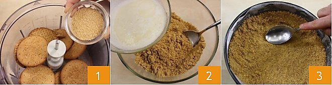 Para preparar la tarta de queso de lima, empiecen preparando la base: pongan las galletas Digestive en un procesador junto con el azúcar moreno 1, tritúrenlas finamente y transfieran la mezcla a un recipiente; mientras tanto, en un cazo, derritan la mantequilla a fuego bajo. Cuando esté fundida, déjenla templar un poco, añádanla delicadamente en hilo fino a las galletas trituradas 2 y mezclen bien todo. Engrasen un molde, preferiblemente con aro desmontable, de 22 cm de diámetro; recorten un disco de papel de horno del mismo diámetro del fondo del molde y dos tiras de la misma altura de los bordes, luego forren el molde. Para esta operación, pueden consultar la ficha de Escuela de cocina: cómo forrar un molde con papel de horno. Vierten las galletas trituradas en el molde y con el dorso de una cuchara compacten bien la base de galleta en toda la superficie 3. Dejen enfriar la mezcla en el frigorífico durante al menos 30 minutos o en el congelador durante unos 10 minutos.