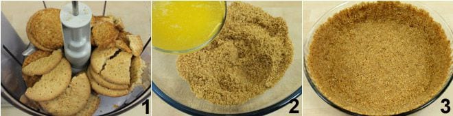 Para preparar la tarta de lima, comienza poniendo las galletas en un procesador de alimentos 1 y tritúralas finamente con las cuchillas, luego transfiérelas a un bol donde agregarás el azúcar granulada (o moreno si prefieres); mezcla y añade la mantequilla derretida 2, luego amalgama bien los ingredientes. Forra, con la mezcla, los bordes y el fondo de un molde con bordes acampanados y de 20 cm de diámetro 3. Ayúdate para realizar esta operación presionando con las manos o con el dorso de una cuchara. Coloca el molde en el horno a 180°C durante unos 10 minutos, luego sácalo y deja enfriar completamente sobre una rejilla.
