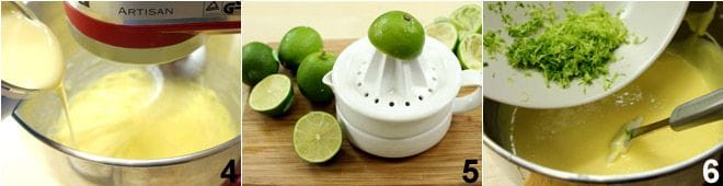 Mientras tanto, prepara la crema para el relleno vertiendo las yemas en un bol (o en la taza de un procesador) y batiendo durante 5 minutos hasta que estén hinchadas, claras y espumosas; en este punto, añade la leche condensada 4 y bate durante otros 5-10 minutos, luego agrega el jugo de lima 5 y bate durante otros 5 minutos. Por último, añade la ralladura de lima 6 e intégrala con los ingredientes.