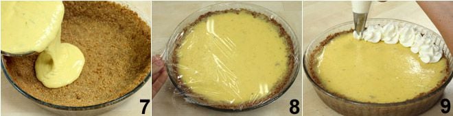 Vierte la crema obtenida dentro del molde forrado con la mezcla de galletas desmenuzadas (ya frío) 7 y hornea a 180°C durante 15 minutos. Una vez transcurrido el tiempo de cocción, saca la tarta de lima y déjala enfriar completamente, luego cúbrela con film transparente 8 y colócala en el frigorífico durante al menos 4 horas (mejor si es toda la noche). Antes de servir la tarta de lima, monta la nata fresca con el azúcar y cubre la superficie del pastel (excepto una pequeña parte en el centro) con la mezcla obtenida, haciendo rosas de nata 9. Como alternativa a la nata, también puedes preparar un merengue italiano y luego cubrir la tarta de lima de la misma manera.