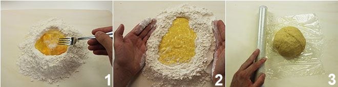 Para preparar las lasañas cupcake, comienza preparando la pasta al huevo: dispón la harina en una superficie de trabajo en forma de montaña, forma un hueco en el centro y rompe los huevos 1 y, con la ayuda de un tenedor, mezcla los huevos con la harina de los bordes. Luego trabaja con las manos la masa 2 hasta incorporar toda la harina, amasando enérgicamente y, si es necesario, añade una cucharada de agua tibia para ablandar la masa. Continúa amasando hasta que la pasta resulte lisa y compacta. Envuelve entonces la pasta obtenida en un film transparente 3 y deja reposar al menos por media hora en un lugar fresco y seco.