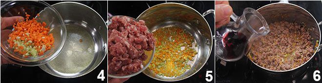 Pasa ahora a la preparación del ragú: pica finamente el apio, la zanahoria y la cebolla y sofríelos, en una cacerola grande, con la mantequilla 4. Deja dorar por 15 minutos y añade la salchicha desmenuzada 5, deja cocinar por un par de minutos y añade el vino tinto 6. Ajusta de sal y pimienta.