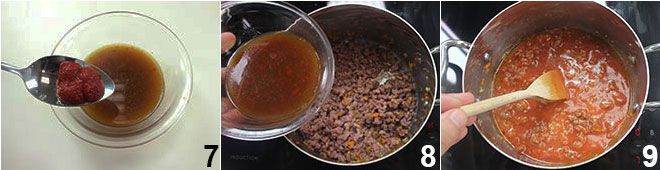 Añade el concentrado de tomate al caldo de carne 7 y agrégalo al sofrito y a la salchicha desmenuzada 8. Deja el ragú al fuego por 15-20 minutos, añade el puré de tomate y continua la cocción, a fuego lento, por al menos 50 minutos. Mientras tanto prepara la bechamel según las indicaciones que encuentras aquí (Bechamel).