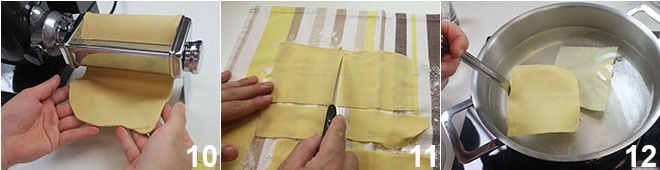 Estira la pasta fresca al huevo con una máquina para estirar la pasta, comenzando por el grosor más grueso hasta llegar al más fino 10. Una vez obtenidas las láminas, corta 12 hojas de pasta de forma cuadrada de lado 10 cm 11. Escalda los cuadrados de pasta por unos segundos en agua hirviendo con sal 12.