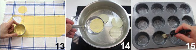 De las láminas restantes, saca 12 círculos de pasta de aproximadamente 6 cm de diámetro 13 y escáldalos también en agua hirviendo con sal 14. Unta con mantequilla un molde para 12 cupcakes o muffins 15 o 12 moldes individuales.