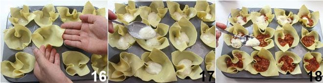Coloca un cuadrado de pasta en cada forma del molde 16 y comienza a componer las lasañas cupcake: pon primero una cucharada de bechamel 17 y luego una de ragú en cada cuadrado de pasta y espolvorea con una cucharada de queso grana rallado 18.