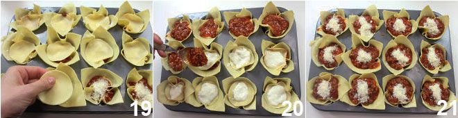 Continúa con otra capa: coloca los círculos de pasta en cada cupcake 19 y cúbrelos con una cucharada de bechamel, una de ragú 2 y una espolvoreada de queso grana rallado. Hornea las lasañas cupcake en horno estático a 160° por 40-45 minutos. ¡Aquí tienes listas para servir tus lasañas cupcake!