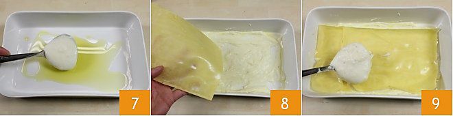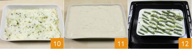 Pasa a ensamblar las lasañas con espárragos y raspadura: coloca en el fondo de una bandeja (o fuente para hornear) de 18x28 cm 3 cucharadas de aceite y una capa de bechamel 7, luego extiende la primera capa de lasaña de huevo 8. Cubre las lasañas con una capa de espárragos y otra de bechamel 9.