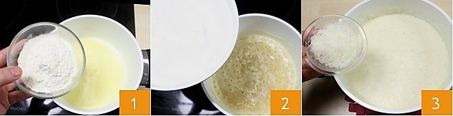 Para preparar las lasañas de espárragos y raspadura, lo primero que hay que hacer es preparar la bechamel; derrite la mantequilla y tamiza la harina en forma de lluvia para crear el roux 1, mezclando con una varilla manual. Agrega la leche ligeramente caliente y mezcla hasta que se espese 2; sala y especia con nuez moscada. Al final de la preparación, con el fuego apagado, incorpora el pecorino y mezcla bien 3.