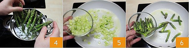 Limpia los espárragos, luego cuécelos en agua hirviendo (debe hervir suavemente) en la olla especial para espárragos, dejando fuera las puntas que se cocinarán con el vapor; los espárragos deben cocerse pero deben quedar crujientes 4. Escurre bien los espárragos: corta las puntas (aproximadamente 5 cm de longitud) y corta los tallos en rodajas. Pon 30 g de mantequilla a derretir en una sartén y sofríe ahí los tallos de los espárragos añadiendo sal (bastarán un par de minutos) 5; de esta manera se secarán del agua de cocción residual y al mismo tiempo se sazonarán. Haz lo mismo en otra sartén con las puntas de los espárragos, cuidando que no se deshagan 6.