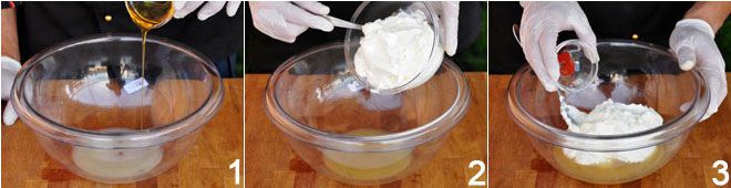 PREPARACIÓN DE LA CARNE Y MARINADO En primer lugar, se procede a la preparación del marinado. Los ingredientes del marinado son 5 partes de yogur, 2 de jugo de lima, 1 de miel de castaño por un sobre de azafrán. Se toma un recipiente grande y no reactivo a los ácidos (vidrio o pyrex por lo tanto) y se vierte el jugo de lima apenas calentado al fuego en el que disolveremos la miel 1. Una vez bien disuelto, se añade el yogur 2 y el azafrán 3 teniendo cuidado de mezclar bien todo 4.