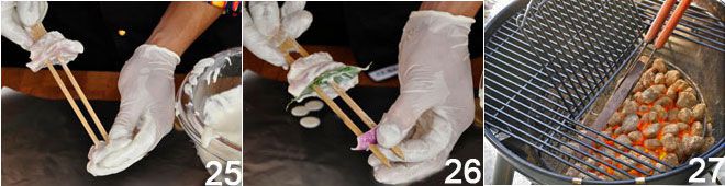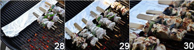 LA COCCIÓN DEL SHISH TAOUK Una vez completada la preparación de las salsas, se puede proceder a la preparación de las brochetas. Es preferible utilizar brochetas de acero de buena calidad, brochetas de madera o brochetas de bambú talladas en horca. Estas últimas son recomendables ya que las individuales, en presencia de líquidos grasos, tienden a girar sobre sí mismas cuando se intenta girarlas para cocinarlas del otro lado. Si no se encuentran brochetas de bambú, se pueden usar en su lugar dos brochetas paralelas que permitirán voltear el kebab más fácilmente. En cualquier caso, si se usan brochetas de madera, es preferible remojarlas durante un tiempo para evitar que se incendien durante la cocción. Se comienza retirando el exceso de marinada y se alternan en la brocheta los cubos de carne, las tiras de cebolla y una hoja de laurel (25-26). De esta manera, cada pieza de carne tendrá un lado en contacto con la cebolla y el otro con el laurel. El calor liberará los aceites esenciales que aromatizarán el cubo. Cuando todas las brochetas estén completas, se pasan a la parrilla 27.