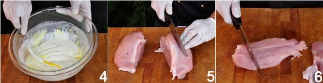 Hecho esto, se corta la pechuga de pavo 5, intentando obtener cubos todos del mismo tamaño (6-7) para permitir una cocción uniforme.