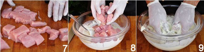 Se ponen los cubos en la marinada 8, se masajean durante unos segundos 9, se cubre con papel film y se coloca en el frigorífico durante al menos 1 hora.