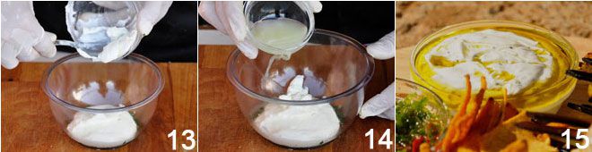 al jugo de lima 14 y luego se mezcla enérgicamente. Se coloca el labneh en un pequeño bol y se cubre la superficie con una capa delgada de aceite de oliva virgen extra 15, que dará sabor y retrasará la oxidación. Guarde el labneh en el refrigerador y déjelo reposar.