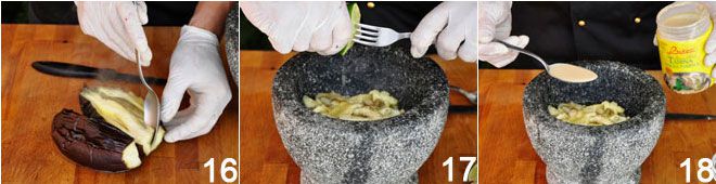 EL BABA GANOUSH (MUTABBEL) Para preparar el baba ganoush (o muttabel) se asa la berenjena al fuego hasta que el exterior esté completamente quemado y el interior resulte blando y cede. Se abre en dos y se recoge con una cuchara la pulpa 16, teniendo cuidado de no raspar demasiado las partes quemadas. Se coloca la pulpa en un mortero, si se desea machacarla a mano o en un vaso para luego usar una batidora de inmersión. Se añade el jugo de lima 17, una generosa porción de tahina 18 junto con un chorrito de aceite virgen extra,