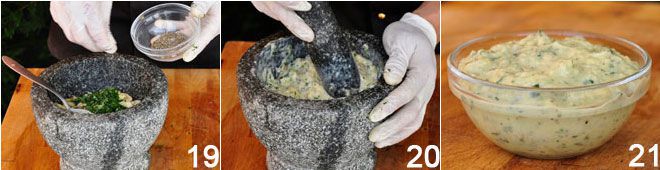 el ajo triturado, la menta (solo al final si se tiene intención de usar la batidora), la sal y la pimienta 19. Se machaca 20 o se bate todo para amalgamar los ingredientes. Se puede optar por obtener una textura gruesa o una emulsión lisa. En este caso hemos preferido una textura gruesa para conferir rusticidad al plato 21.