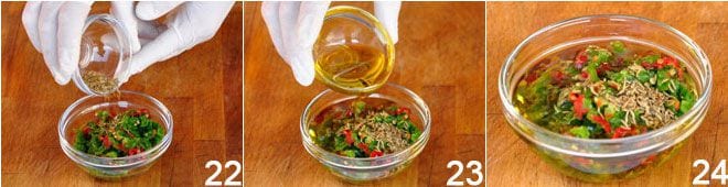 EL MUHAMMARA Se pican los pimientos dulces y picantes teniendo cuidado de no reducirlos a pulpa, ya que las semillas y la piel conferirán una nota rústica. Añadir comino 22, solo un poco de sal, jugo de lima, el aceite 23 y mezclar enérgicamente 24.