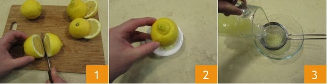 Para preparar la limonada de menta, comienza por quitar las hojas de los limones, si aún las tienen, luego enjuágalos, sécalos y córtalos por la mitad 1. Para obtener el máximo jugo, exprime con un exprimidor todas las mitades de los limones 2, después vierte el jugo en un recipiente donde habrás colocado un colador de malla fina 3.
