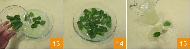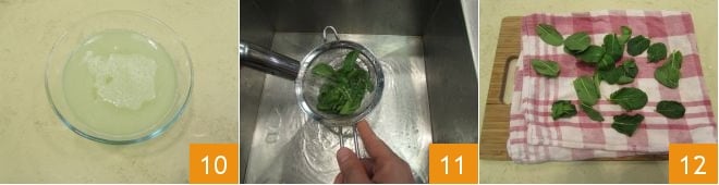 Aparte el recipiente 10 y mientras tanto ocúpate de la menta, después de haber quitado todas las hojas de la ramita, enjuágalas 11 y sécalas delicadamente con un paño de cocina limpio 12