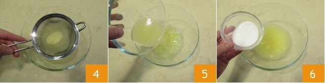 De esta manera filtrarás el jugo evitando que residuos de pulpa y semillas terminen en el jugo de limón 4, luego vierte el jugo en un recipiente más grande, deberías obtener 430 gramos 5, y añade el azúcar 6.